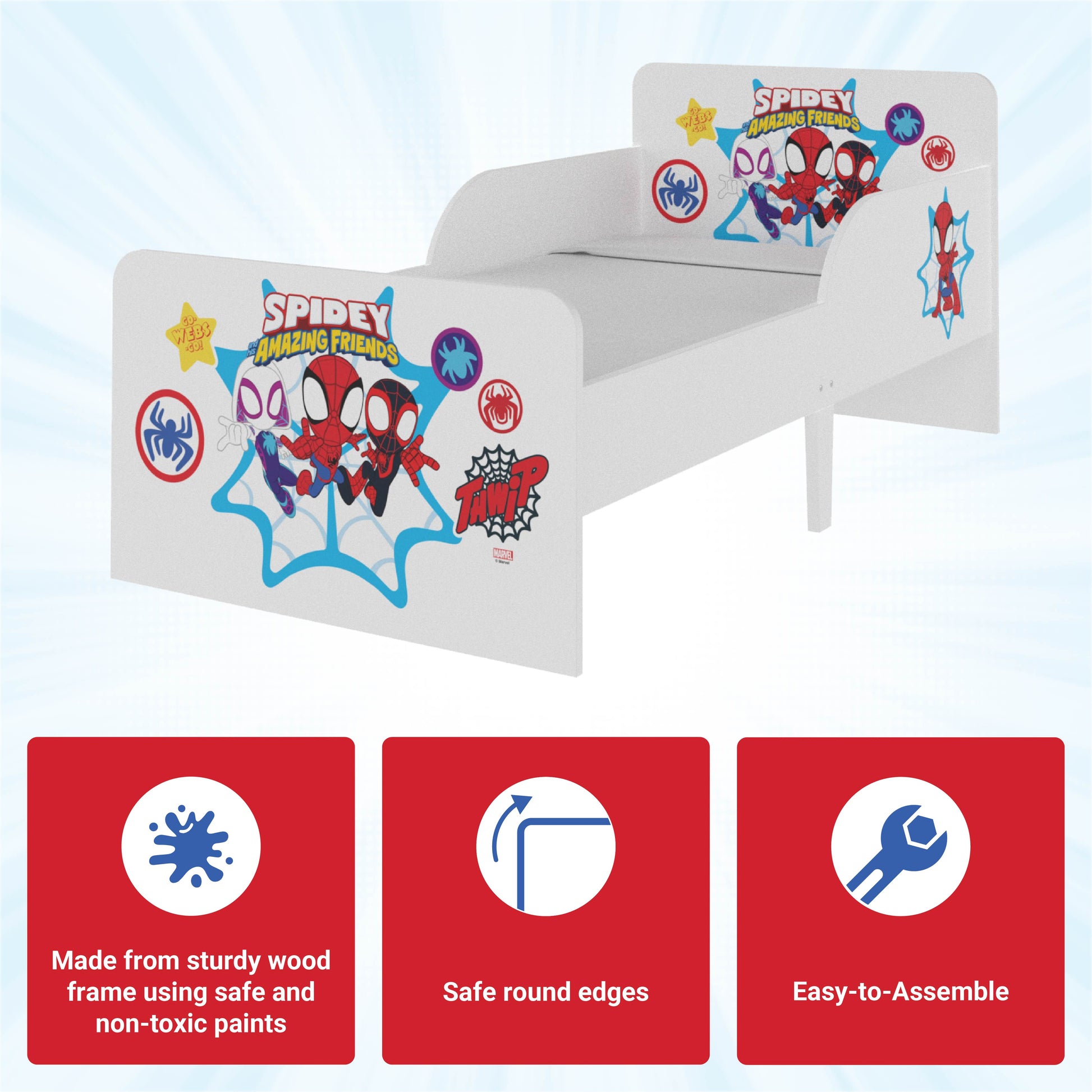 - Bring the Marvel magic to bedtime! This Spidey & His Amazing Friends toddler bed features vibrant character graphics of Spider-Man, creating a fun and exciting sleep space for your little hero.